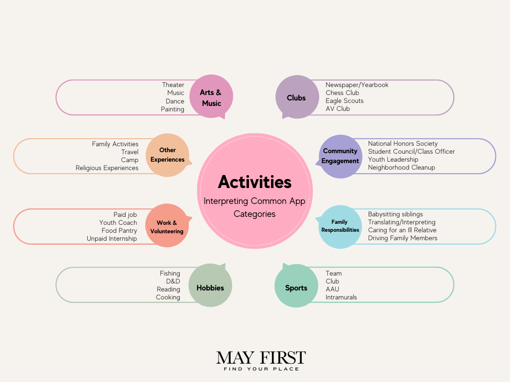 The Common App allows you to add up to 10 activities to your college application and offers 8 categories to help guide you (though you will not need to have each category represented).